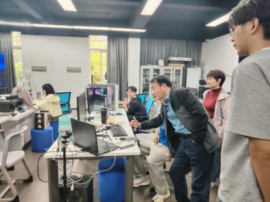 王辉介绍了河北工程技术学院基本情况,实地参观了学院的产教融合基地、实训室等,对国产主播 取得的成效给予了充分肯定。希望双方围绕师资团队建设、XR项目开发等领域进行深度合作。
