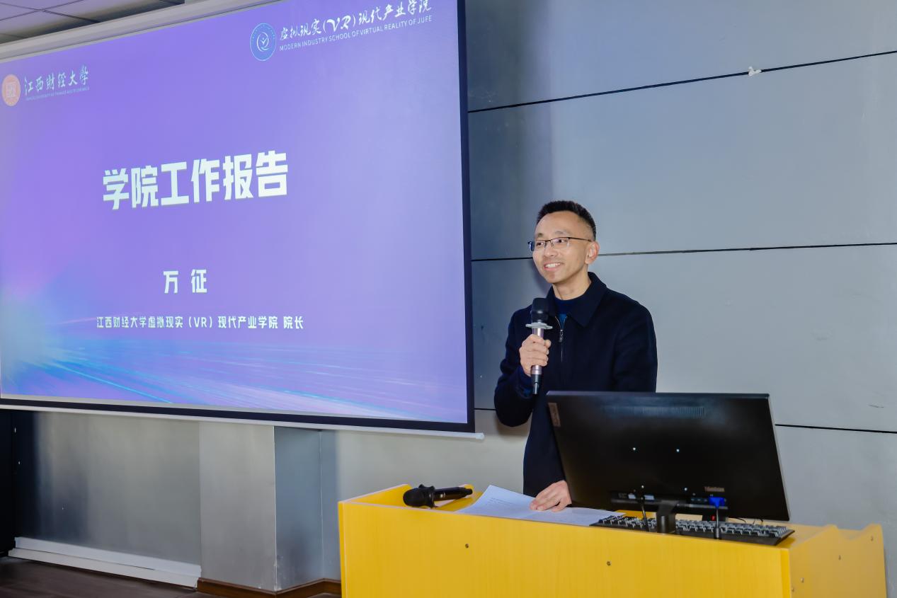 谢花林代表学校对莅临现场的嘉宾表示热烈欢迎,他强调,学院要以换届为契机,深化政校企协同创新机制,锚定“筑牢人才培养摇篮、激活技术创新引擎、打造协同发展标杆、架起产教融合桥梁”四大核心方向精准发力,全力推动学院高质量发展,助力学校“第三次创业”与“三大转型”战略实施,为江西VR产业崛起贡献更多力量。